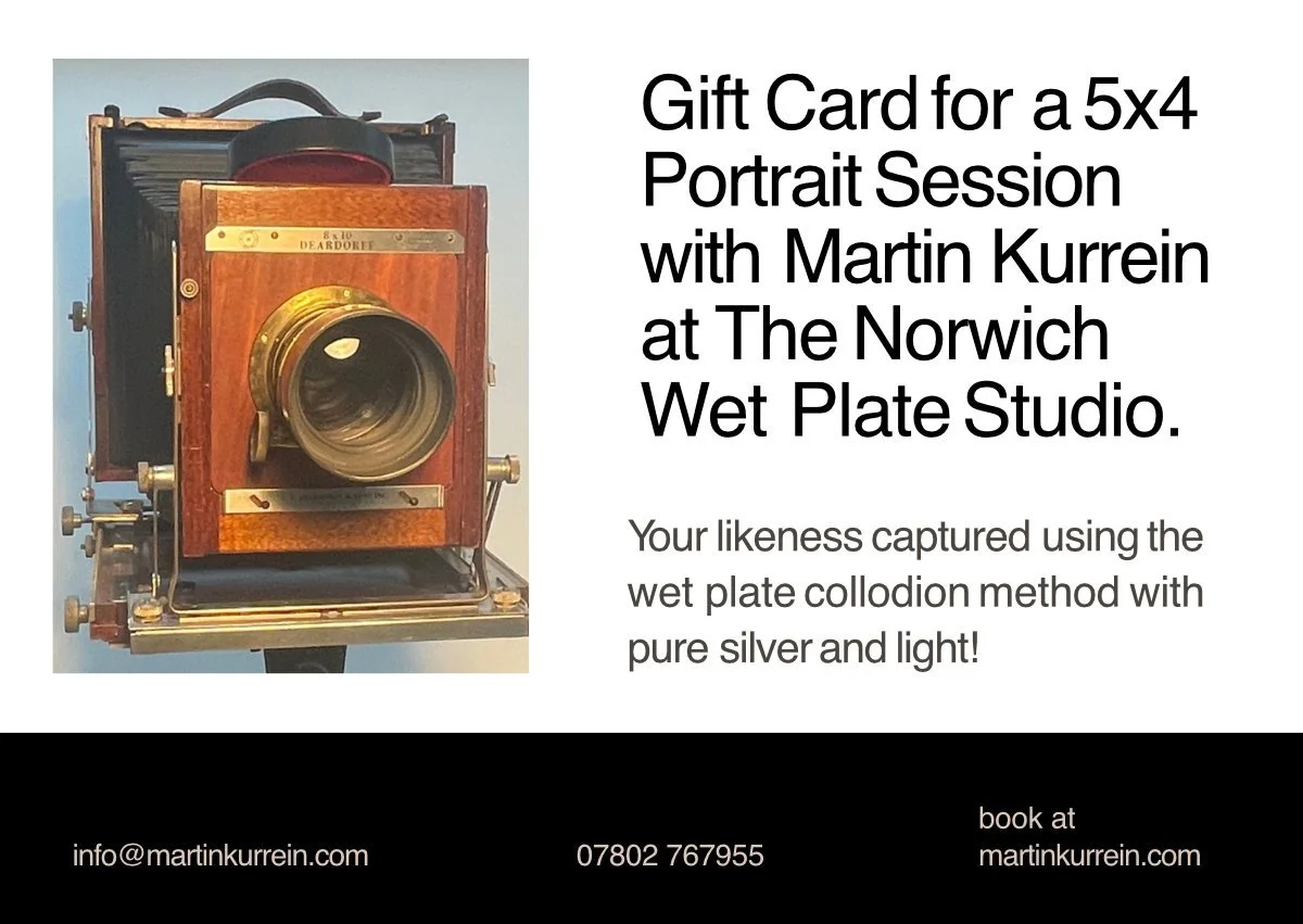 This gift is of a wet plate collodion portrait session with Martin Kurrein at The Norwich Wet Plate Studio. You can redeem it by booking online at www.martinkurrein.com.